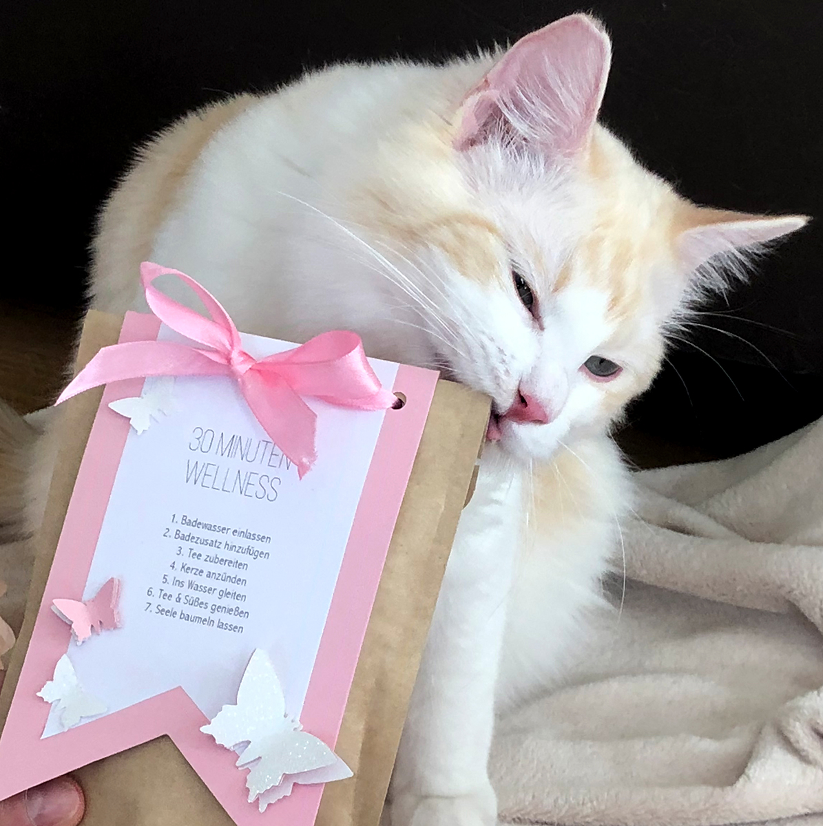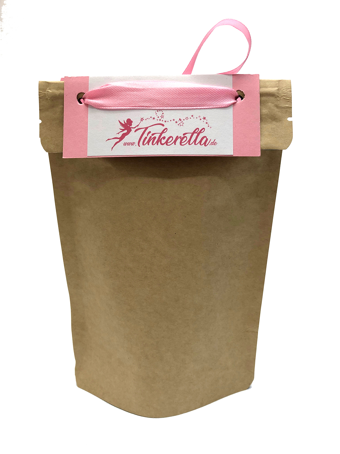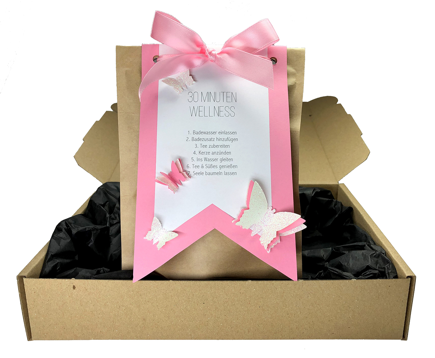 Jede einzelne Verpackung der Geschenksets von Tinkerella ist handgefertigt und passend zum Inhalt und Thema gestaltet. Das 30 Minuten Wellness Set wird mit 3-D-Schmetterlingen in einem aus Seidenpapier angerichteten Bett in einer Tinkerella Verpackung sicher versendet, damit es wohlbehalten beim Empfänger ankommt.