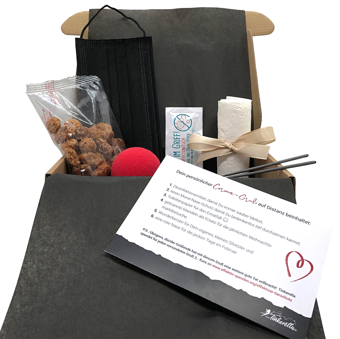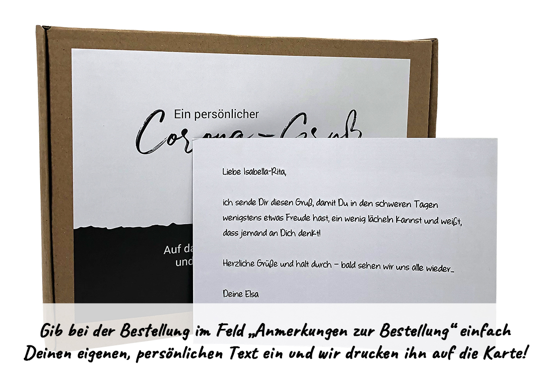 Dein „Corona-Gruß“ von ♥-en mit einer persönlichen Nachricht von Dir für den Empfänger, welche komplett auf eine Postkarte übertragen und dem Paket beigelegt wird,