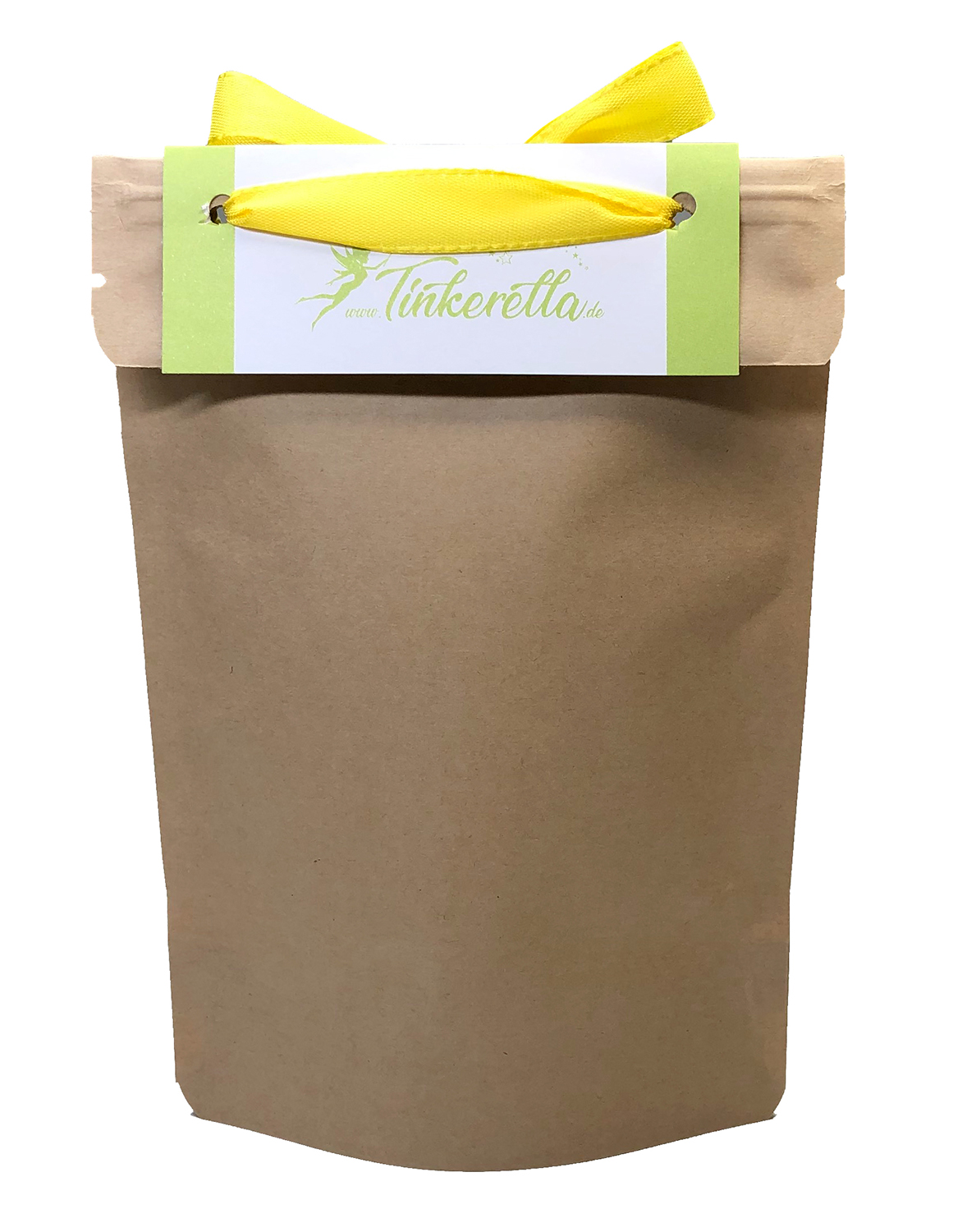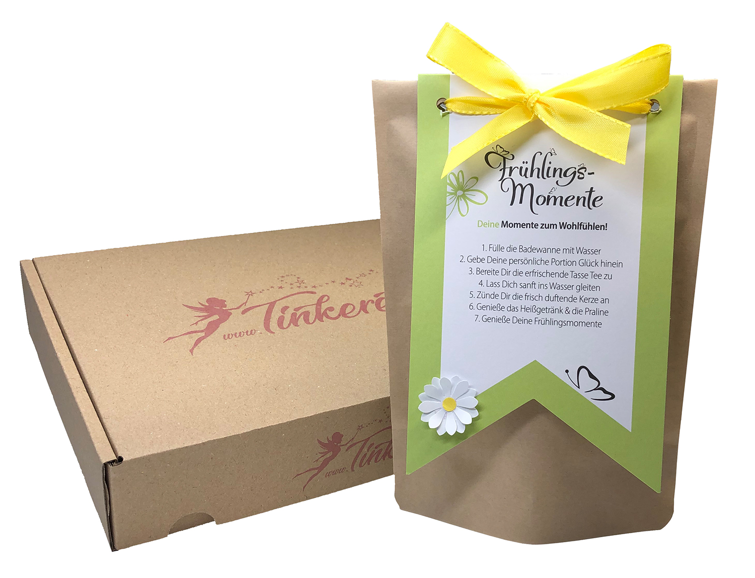 Jede einzelne Verpackung der Geschenksets von Tinkerella® ist handgefertigt und passend zum Inhalt und Thema gestaltet. Das Frühlings-Momente Wellness Set wird mit einem handgefertigten 3-D-Gänseblümchen in einem aus Seidenpapier angerichteten Bett in einer Tinkerella® Verpackung sicher versendet, damit es wohlbehalten beim Empfänger ankommt.