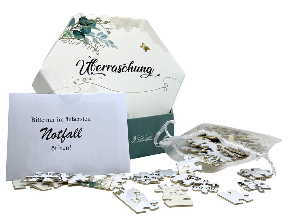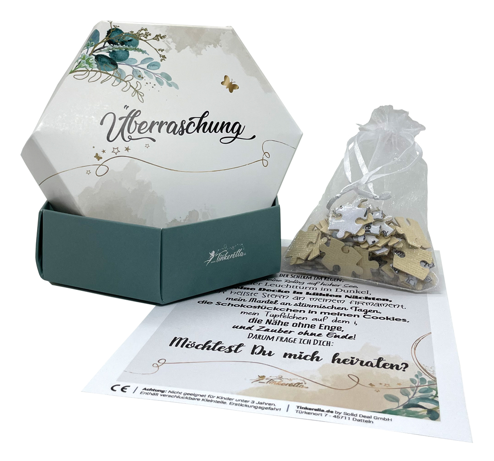 Überreiche Deinem Partner oder Deiner Partnerin eine wunderschön gestaltete, 6-eckige Schachtel aus stabilem Karton mit der Aufschrift “Überraschung”… Innen befindet sich ein (selbstverständlich) zerlegtes Puzzle in A5-Größe, bestehend aus 80 festen Teilen, die von der auserwählten Person zusammengesetzt werden müssen.