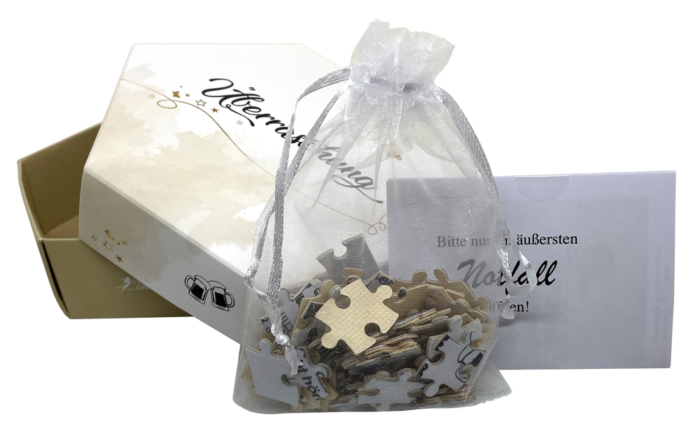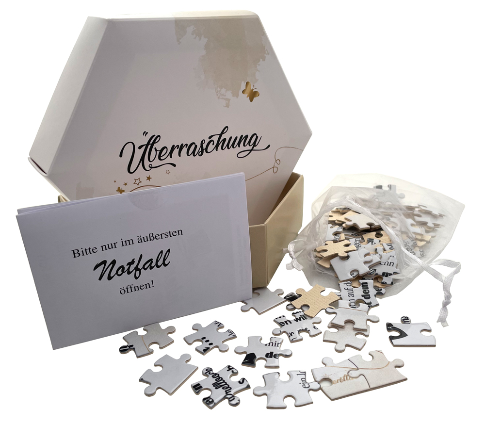 Überreiche ihm eine besondere, 6-eckige Schachtel aus stabilem Karton mit der Aufschrift “Überraschung”… Innen befindet sich ein – selbstverständlich zerlegtes – Puzzle in A5-Größe, bestehend aus 80 festen Teilen in einem kleinen Säckchen, die von Deinem Trauzeugen in spe zusammengesetzt werden müssen.
