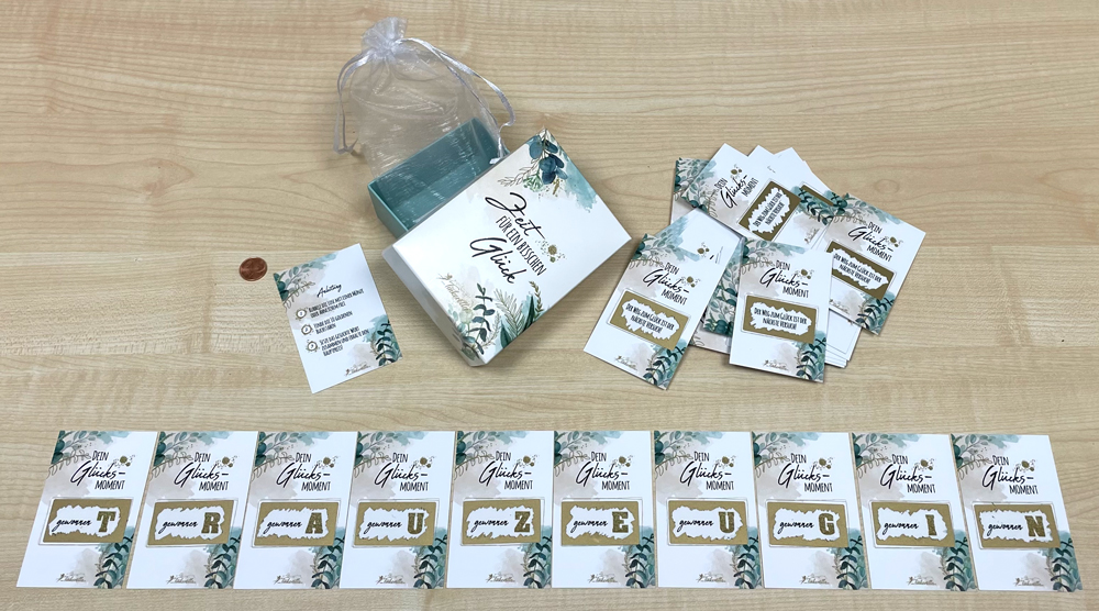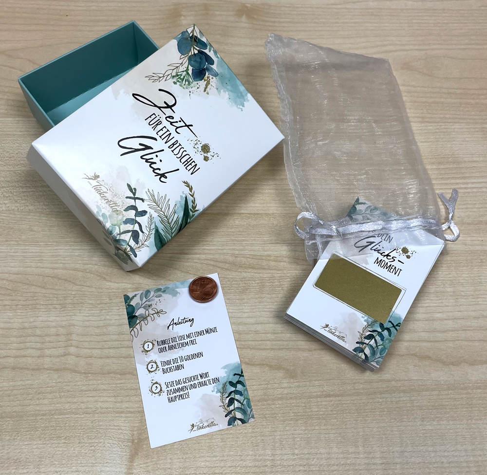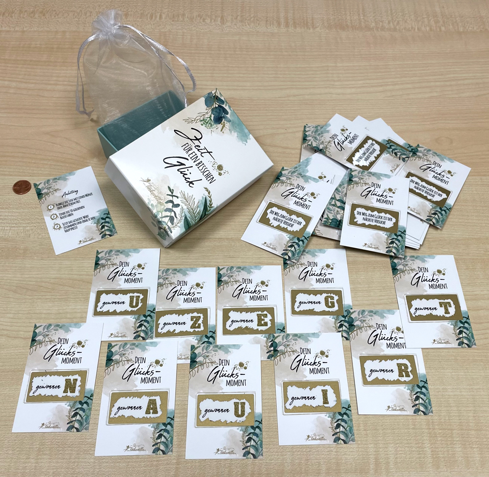 Die oberste Karte des Stapels ist eine Anleitung, damit die Beschenkte auch weiß, worum es geht. Auf dieser Anleitung befindet sich zudem ein darauf befestigter Glücks-Cent, welcher als Rubbelhilfe genutzt werden kann.
